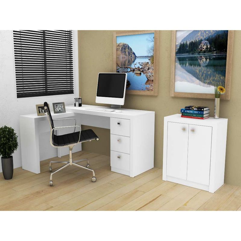EscritórioConjunto para escritórioConjunto para Escritório Mesa em L e Balcão 2 Portas - Branco