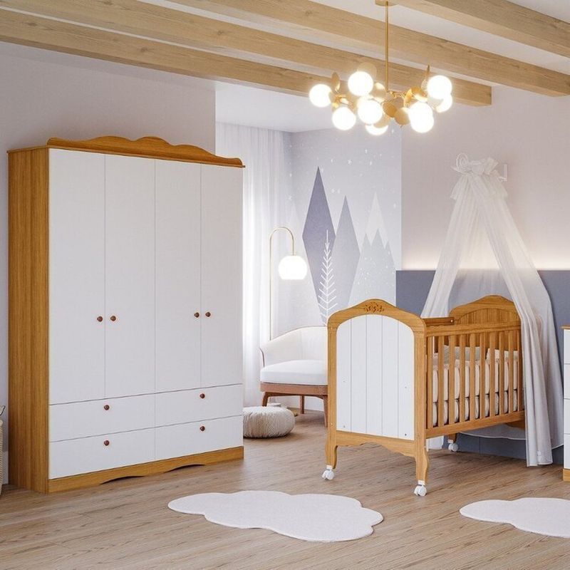 Quarto de Bebê 2 Peças com Berço e Guarda-roupa 4 Portas 4 Gavetas Aquarela Espresso Móveis Nature/Branco