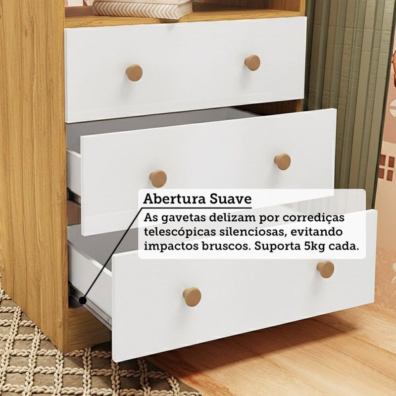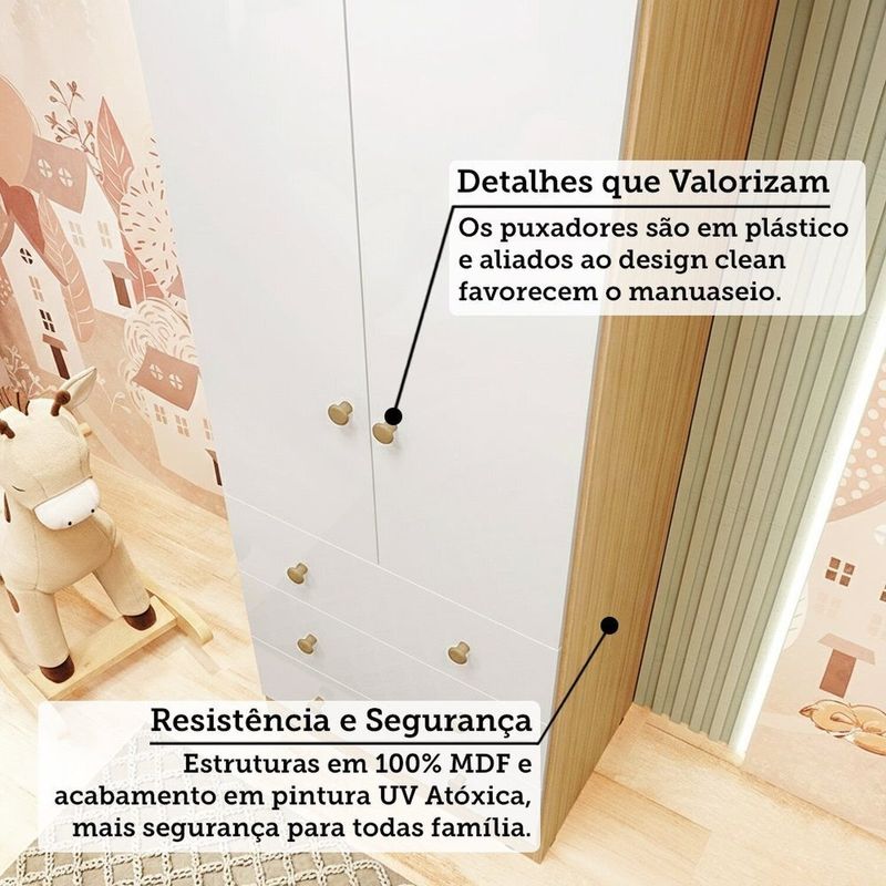 Quarto Infantil com Guarda Roupas 2 Portas 3 Gavetas e Cômoda 3 Gavetas Teka Espresso Móveis Branco Brilho